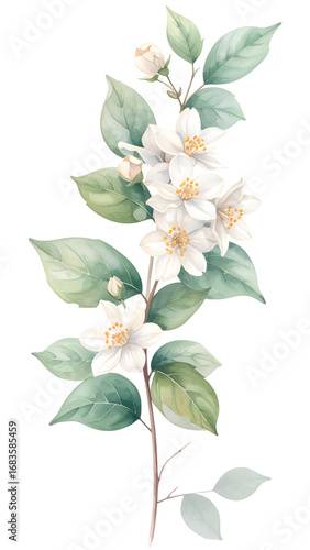 © Supanun, Obraz premium Delicate Jasmine Blossom Branch: A breathtaking display of jasmine, captured in intricate detail, Botanical for Wedding Invitation, Greeting Card, Decorative Design.