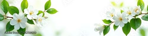 © Theerawat, Obraz premium Delicate jasmine blossoms and lush green leaves isolated on white , fragrant, image, beauty
