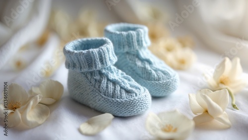 Obraz premium Delicate knitted baby booties in light blue surrounded by flower petals and...