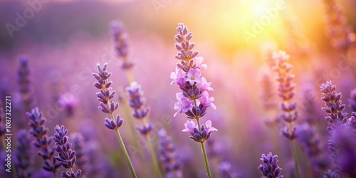 © Collection, Naklejka premium Delicate Lavender Blossoms Bathed in Golden Sunlight, Their Purple Hues Shimmering Amidst a Field of Fragrant Flowers