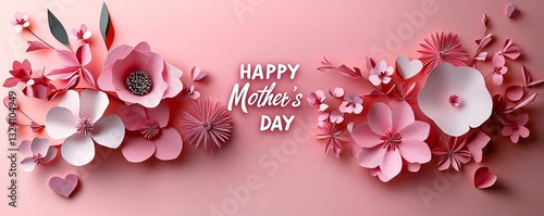 © NE97, Fototapeta premium Delicate layered paper flowers in soft pinks and whites create a romantic backdrop for Mother's Day celebrations, ideal for greeting cards or event invites.
