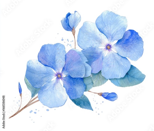 © rega, Fototapeta premium Delicate light blue flowers with watercolor-style petals and leaves