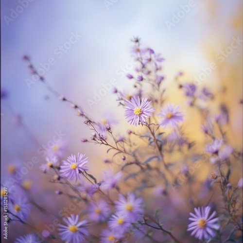 © art, Naklejka premium Delicate, light purple flowers in soft focus, bathed in a gentle sunset glow