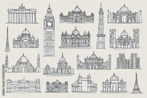 Fototapeta premium Delicate Line Drawings of Famous Landmarks on Light Backgrounds Showcasing...