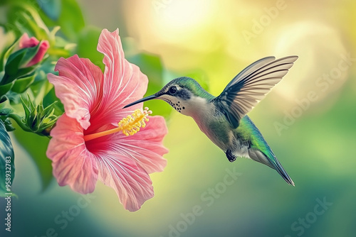 © Ostrich, Naklejka premium Delicate little hummingbird or sugarbird hovering beside a pink hibiscus flower drinking nectar. Mottled green lush nature background with copy space.
