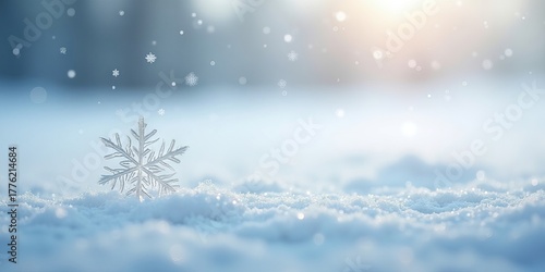 © Amarylle, Naklejka premium Delicate macro snowflake on sparkling fresh snow, illuminated by soft winter light with ethereal bokeh background, capturing the serene beauty of ice crystals.