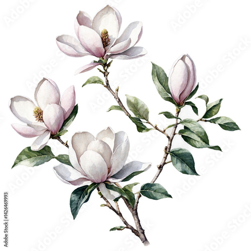 © Arceli, Obraz premium Delicate magnolia flowers and leaves in cutout designs watercolor art illustration transparent background isolated png stock