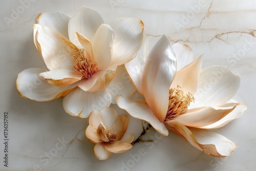 © Siti, Fototapeta premium Delicate magnolias in soft, muted tones, arranged on a light marble surface, showcasing intricate details and subtle color variations.