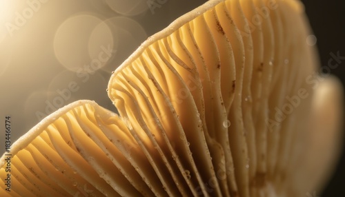 © Mr. Stocker, Fototapeta premium Delicate mushroom gills with tiny water droplets are illuminated by warm, golden sunlight, creating a magical and serene natural abstract pattern