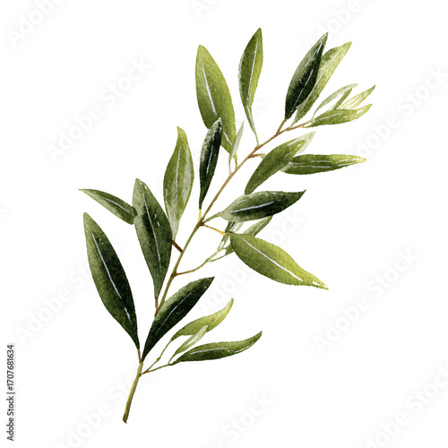 © Muarastock, Naklejka premium Delicate olive branch depicted in watercolor style with transparent background and no fruit