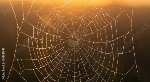 Obraz premium Delicate Orb Web Enshrouded in Dewdrops, Bathed in Gentle Golden Light
