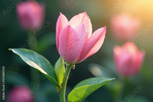 Fototapeta premium Delicate Orquid stem with soft pink petals and green leaves, flowers, botany,...