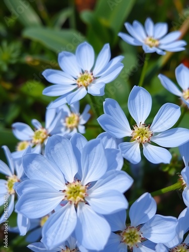 Fototapeta premium Delicate pale blue flowers bloom brightly under soft sunlight. AI Generated