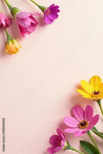 © napak, Fototapeta premium Delicate pastel blossoms arranged on a soft pink background, creating a charming floral border with ample space for text or design elements.