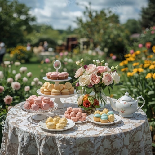 © Shreya, Naklejka premium Delicate pastel-colored desserts arranged on wooden garden table