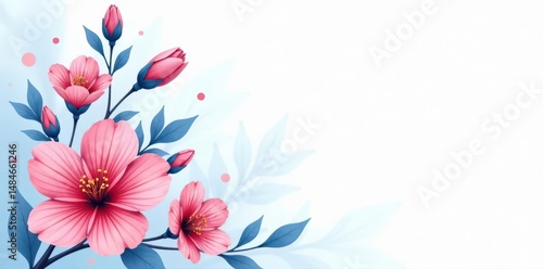 © Yuwadee, Naklejka premium Delicate pastel floral print; blue, pink, red blossoms on white , elegant, flower illustration, vibrant