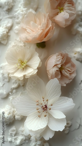 © indah, Fototapeta premium Delicate pastel flowers adorn a textured cake