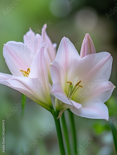 Fototapeta premium Delicate Pastel Lilium Flowers Blooming in Lush Green Garden Setting :...