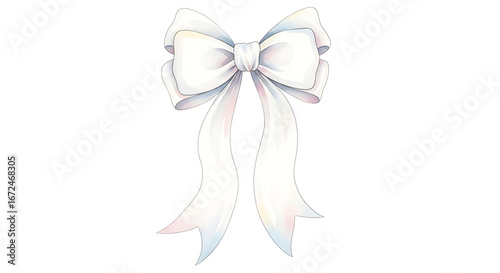 © Saba, Naklejka premium Delicate pastel ribbon bow watercolor illustration with soft gradient hues, pale pink-blue satin bow for gift wrapping and craft design, elegant decorative bow with flowing tails