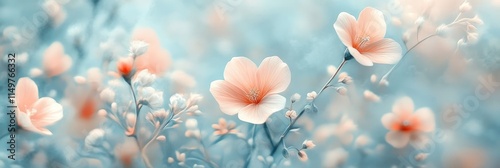 © LyceeChee, Fototapeta premium Delicate Peach Blossoms in a Soft Blue Garden
