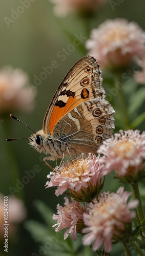 Obraz premium Delicate peach fuzz butterfly resting on flowers against a minimal background.