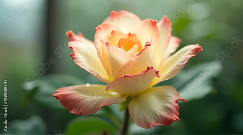 © rifan, Fototapeta premium Delicate peach rose close-up on blurred green background for romantic cards and floral prints.