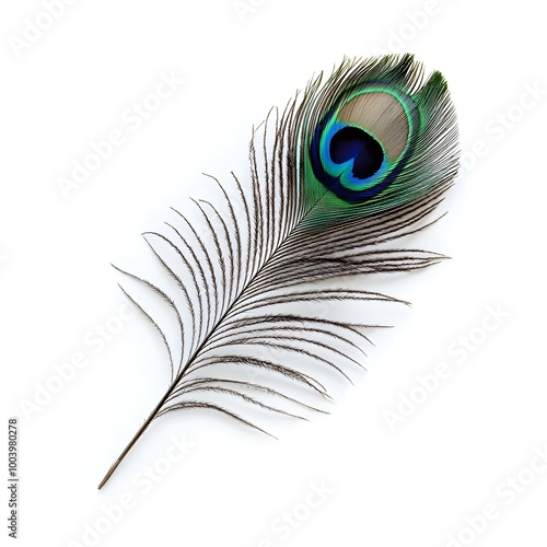 © yelosole, Obraz premium Delicate Peacock Feather with Intricate Eye Pattern on White Background