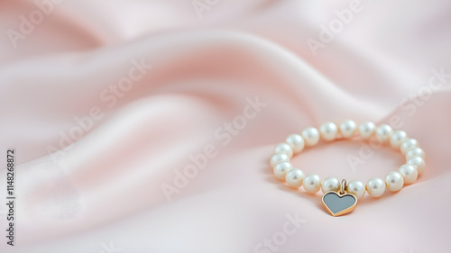 Fototapeta premium Delicate Pearl Bracelet: A timeless and elegant pearl bracelet with a heart charm, resting on a soft pink satin background. This image evokes feelings of femininity, love, and sophistication.