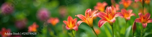 © Pusit, Fototapeta premium Delicate Peruvian lily flowers in a garden with lush greenery, peruvian lily, flowers