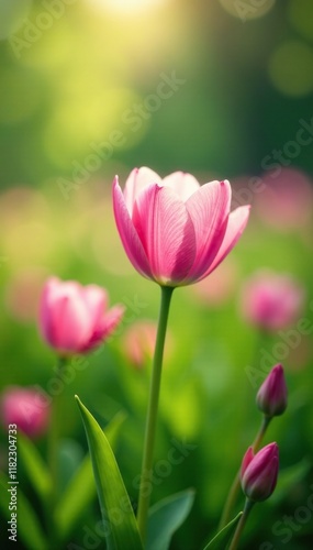 © chaiwat, Fototapeta premium Delicate petals unfolding in a lush green field, spring bloom, panorama