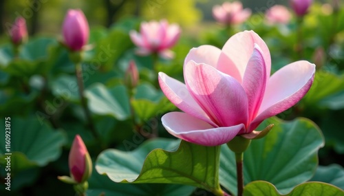 Obraz premium delicate petals unfurl from magnolia blossoms, garden, foliage, peaceful