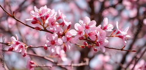 Obraz premium Delicate pink almond blossoms burst forth on slender branches, bathed in sunlight, flora, plant