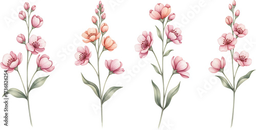 © Melissa Jennings, Naklejka premium Delicate pink and peach blossoms on slender stems with subtle green leaves depicted in watercolor style set against a transparent background pink flowers