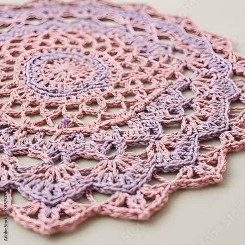 Fototapeta premium Delicate Pink and Purple Crochet Mandala Doily A Charming Handmade Home Decor