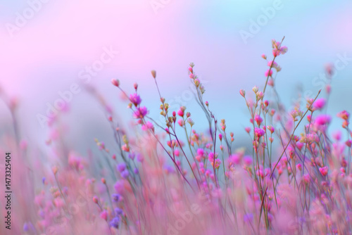 © ppearlgrey, Fototapeta premium Delicate pink and purple flowers sway gently in soft, dreamy landscape