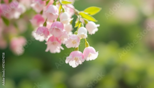 © Firman Dasmir, Fototapeta premium Delicate Pink and White Bell Flowers in a Gentle Sunlight with a Soft Green Background