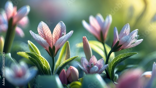 © khoirurizal1, Fototapeta premium Delicate pink and white flowers bloom among lush green leaves in soft focus