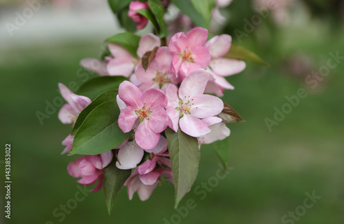 © Tatsiana, Obraz premium Delicate pink apple blossoms on a tree branch with green leaves in early spring.