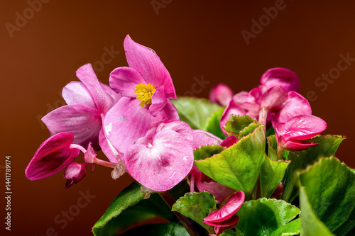 Obraz premium Delicate Pink Begonia Blossoms with Yellow on Warm Brown