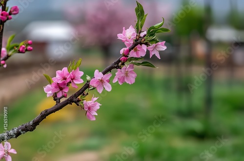 © bocheng, Obraz premium Delicate Pink Blossom Branches Gracefully Framing a Lush Green Landscape Under Soft Natural Light