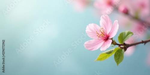© Kittipat, Fototapeta premium Delicate Pink Blossom on a Branch Against a Soft Blue Background, a Symbol of Spring's Gentle Arrival and the Beauty of Nature's Renewal