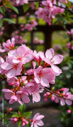 © Rainyphoto, Fototapeta premium Delicate pink blossom unfolds in peaceful garden nook , bloom, botany
