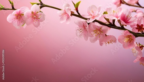 Fototapeta premium Delicate Pink Blossoms: A branch of soft pink cherry blossoms gently graces a delicate pink background, creating a serene and romantic atmosphere.