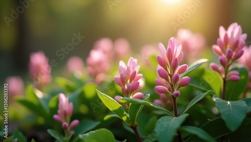 © Seyyar, Obraz premium Delicate pink blossoms emerging through the foliage in the garden