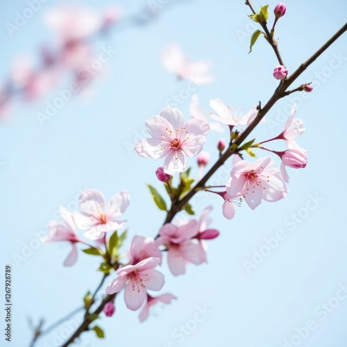 Fototapeta premium Delicate pink blossoms gently sway in the breeze on a light blue background,...