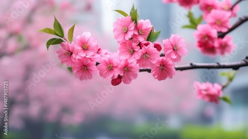 © khonkangrua, Obraz premium Delicate Pink Blossoms in Soft Focus Against Blurry Background of Trees