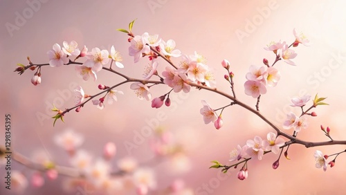 Fototapeta premium Delicate Pink Blossoms on a Branch, Illuminated by Soft Sunlight, a Symbol of...