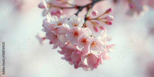 Fototapeta premium Delicate Pink Blossoms on a Branch, Softly Illuminated by Sunlight, a Symbol...