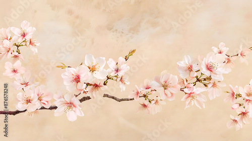 © samiranaj, Obraz premium Delicate pink blossoms on light beige branches.
