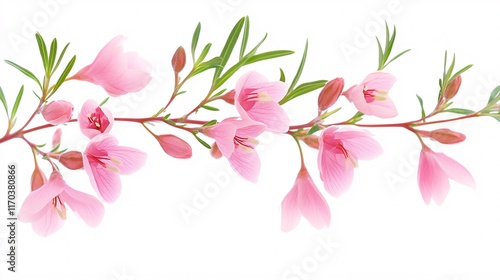 © Nathan, Fototapeta premium Delicate pink blossoms with green leaves, creating a fresh and vibrant floral arrangement.